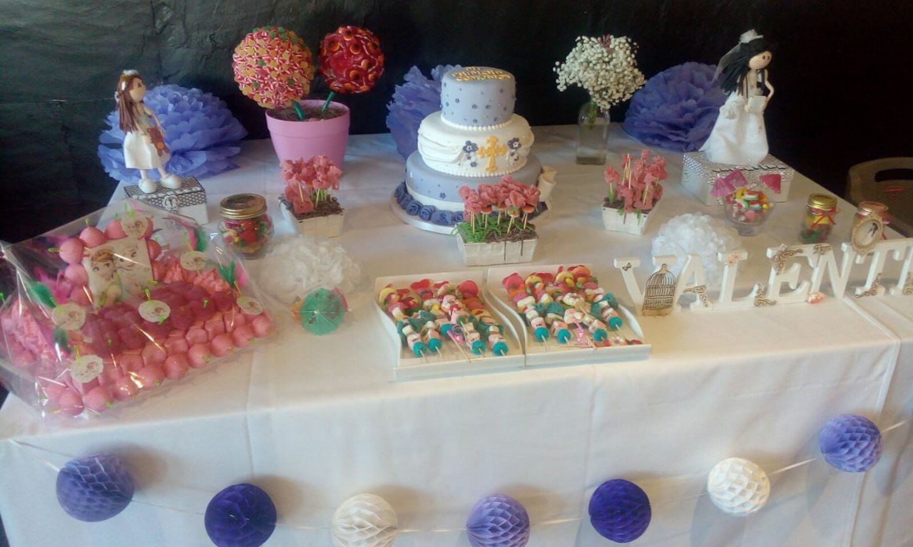 Diseño y montaje de una mesa dulce con una selección variada de chuches, mini tartas y dulces, adaptada para eventos pequeños. Incluye alquiler de bases y decoración básica.